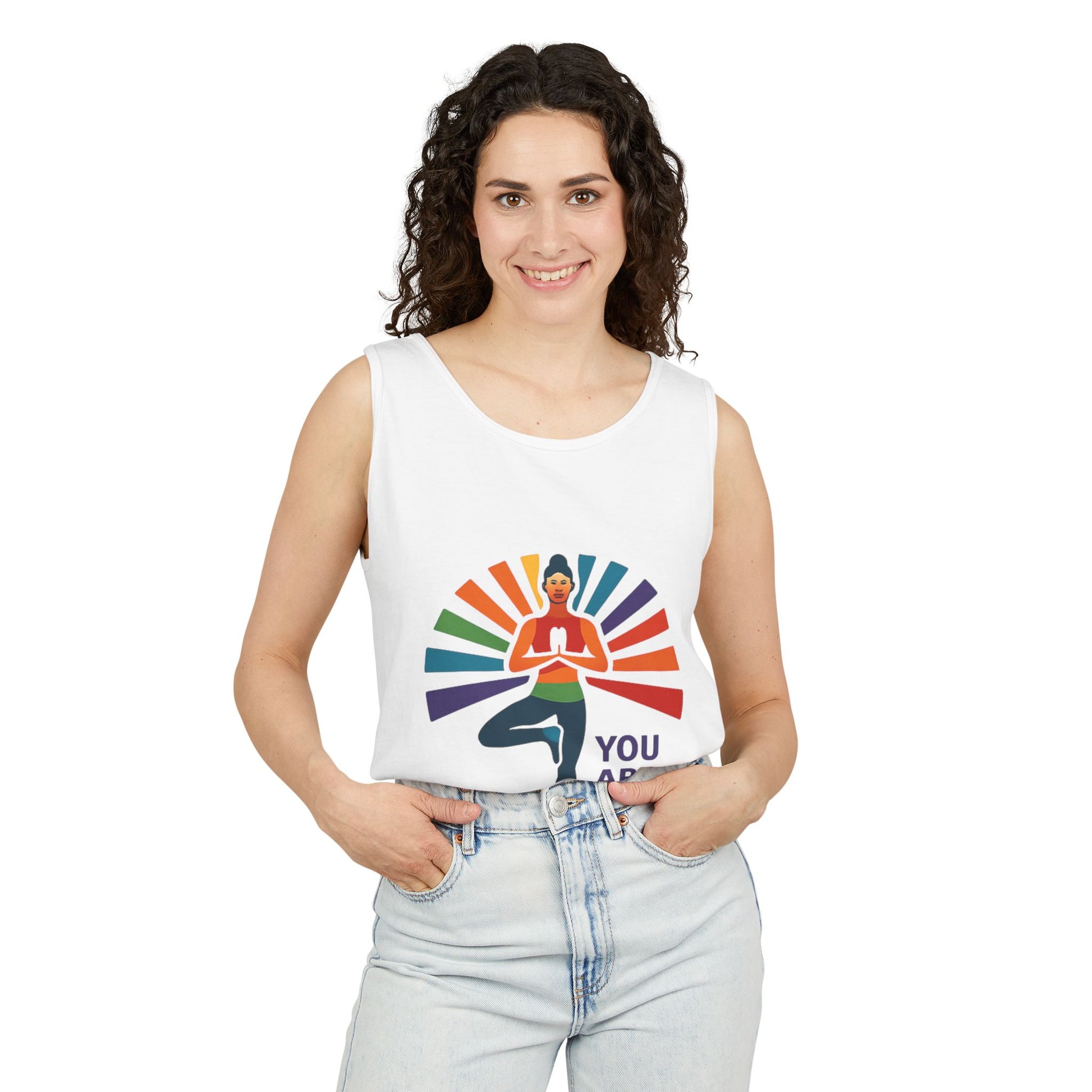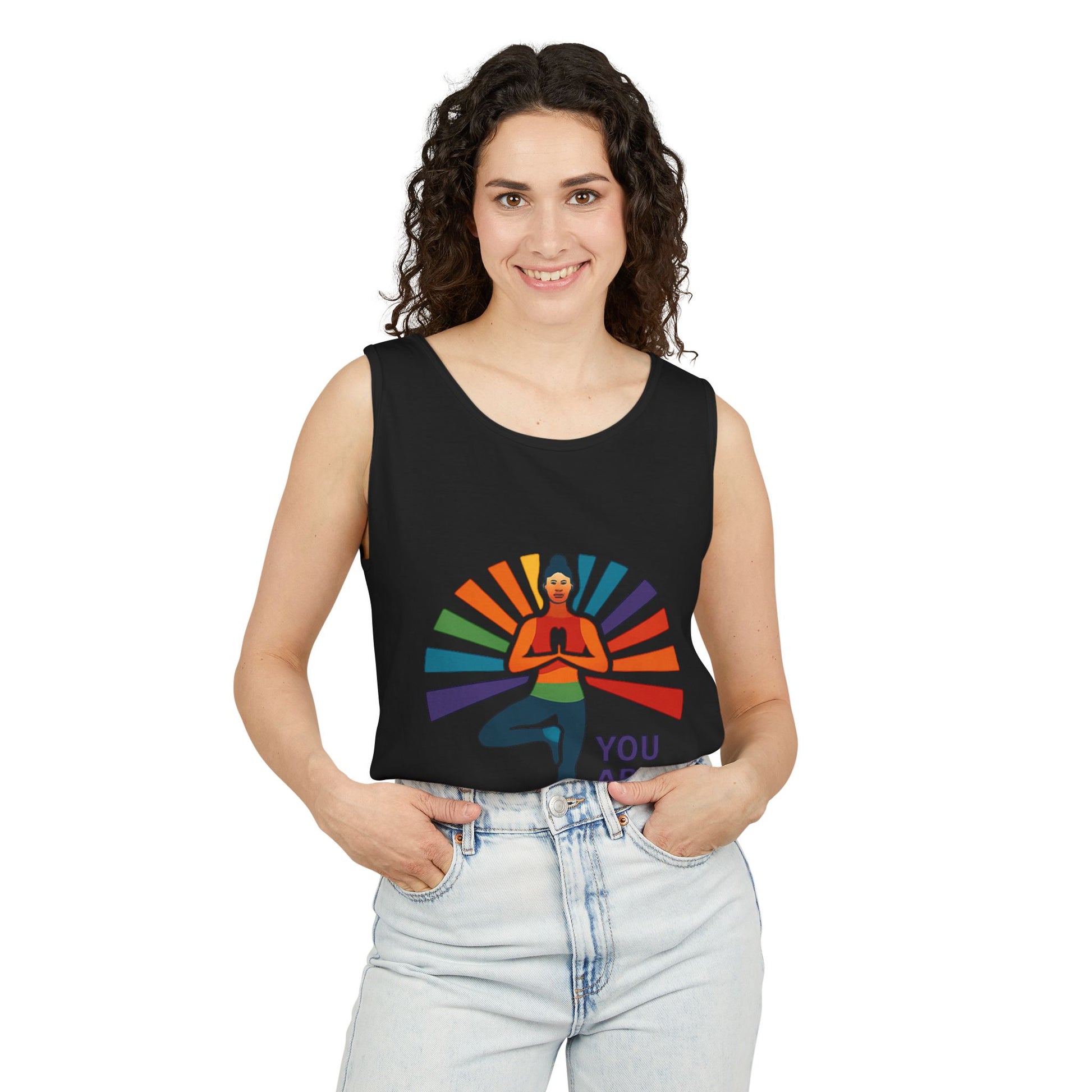 Elevate your wardrobe with this stylish Unisex Tank Top, designed to inspire and uplift. The vibrant print of a serene figure in a meditative pose complemented by a rainbow backdrop embodies positivity and self-love. Perfect for yoga sessions, casual outings, or simply lounging at home, this tank top is a must-have for those who appreciate comfort and style. Its relaxed fit and soft garment-dyed fabric will keep you feeling cozy while spreading a powerful message: "You Are Enough." Ideal for wellness enthusiasts, yoga practitioners, or anyone looking to add a boost of motivation to their daily life. This tank top is also a thoughtful gift for special occasions such as birthdays, holidays, or self-care celebrations, making it a versatile addition to any wardrobe.